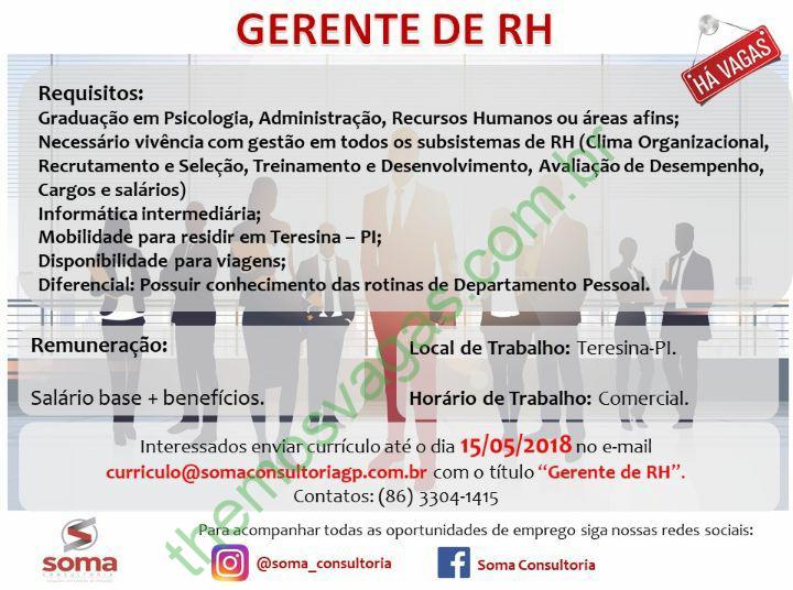 Interessado(as) e que atendam aos requisitos devem enviar o perfil profissional até 15/05/2018 contendo no título do e-mail “Gerente de RH” para curriculo@somaconsultoriagp.com.br