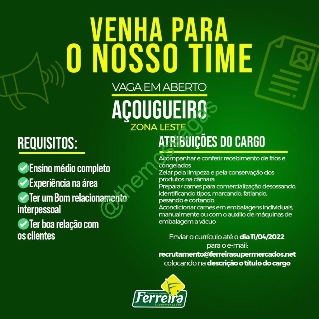 – Interessados(as) e que atendam ao perfil solicitado acima, devem enviar o currículo até 11/04/2022  para o e-mail recrutamento@ferreirasupermercado.net contendo no título/assunto “Açougueiro THE