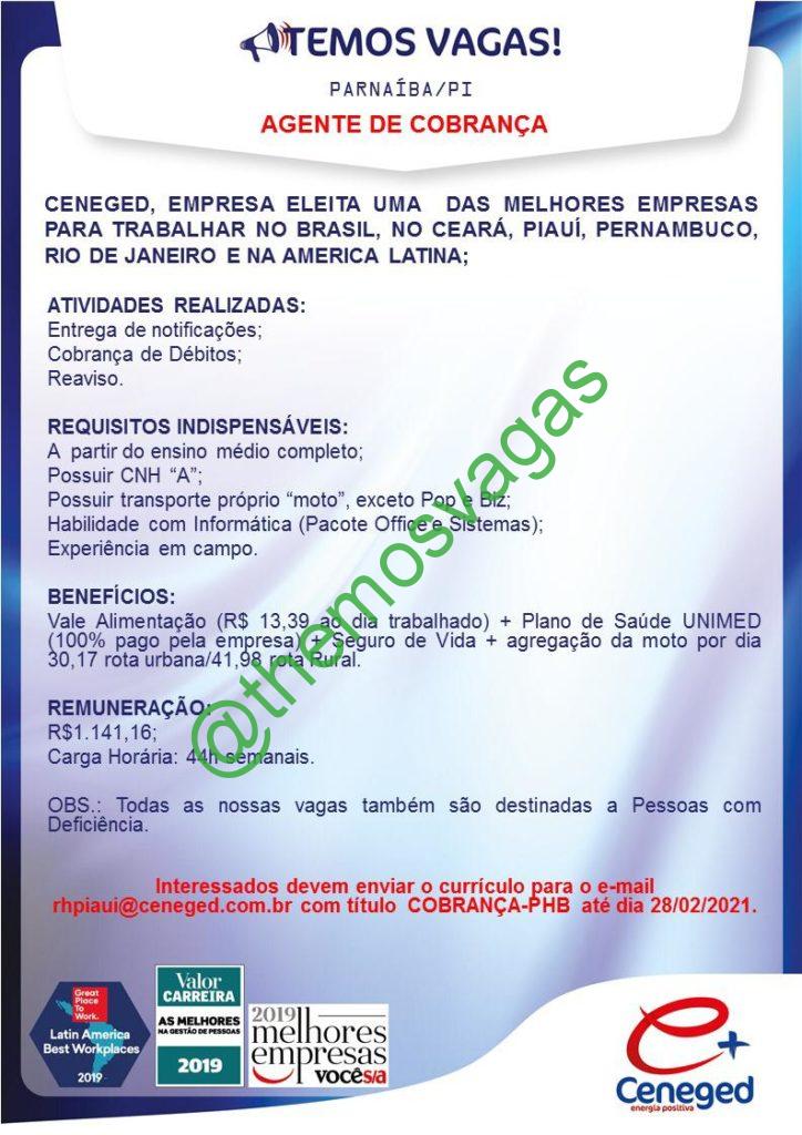 – Interessados(as) e que atendam ao perfil solicitado acima, devem enviar o currículo até 28/02/2021 para o e-mail rhpiaui@ceneged.com.br contendo no título/assunto “Cobrança-PHB“.