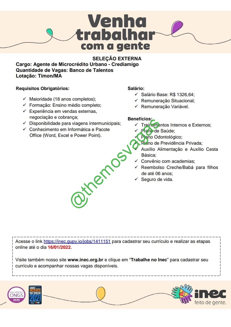 – Interessados(as) e que atendam ao perfil solicitado acima, devem cadastrar o currículo até 16/01/2022 através do site de cadastro inec.gupy.io/jobs/
