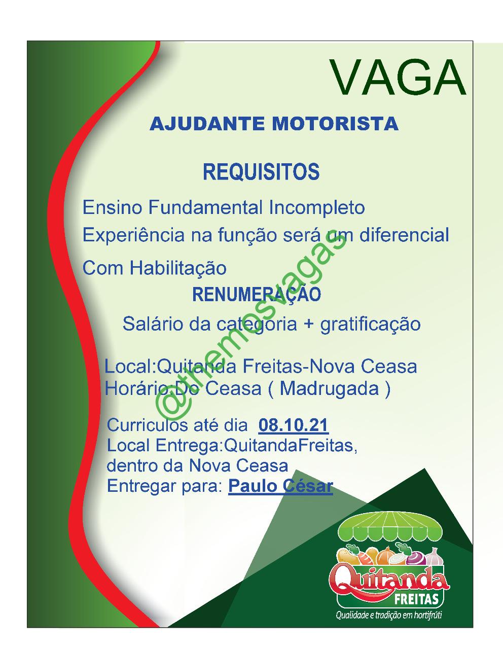 – Interessados(as) e que atendam ao perfil solicitado acima, devem entregar o currículo até 08/10/2021 na sede da “Quitanda Freitas” dentro na Nova CEASA na Av. Henry Wall de Carvalho, 5000 – Parque São João, Teresina/PI, aos cuidados de Paulo César.