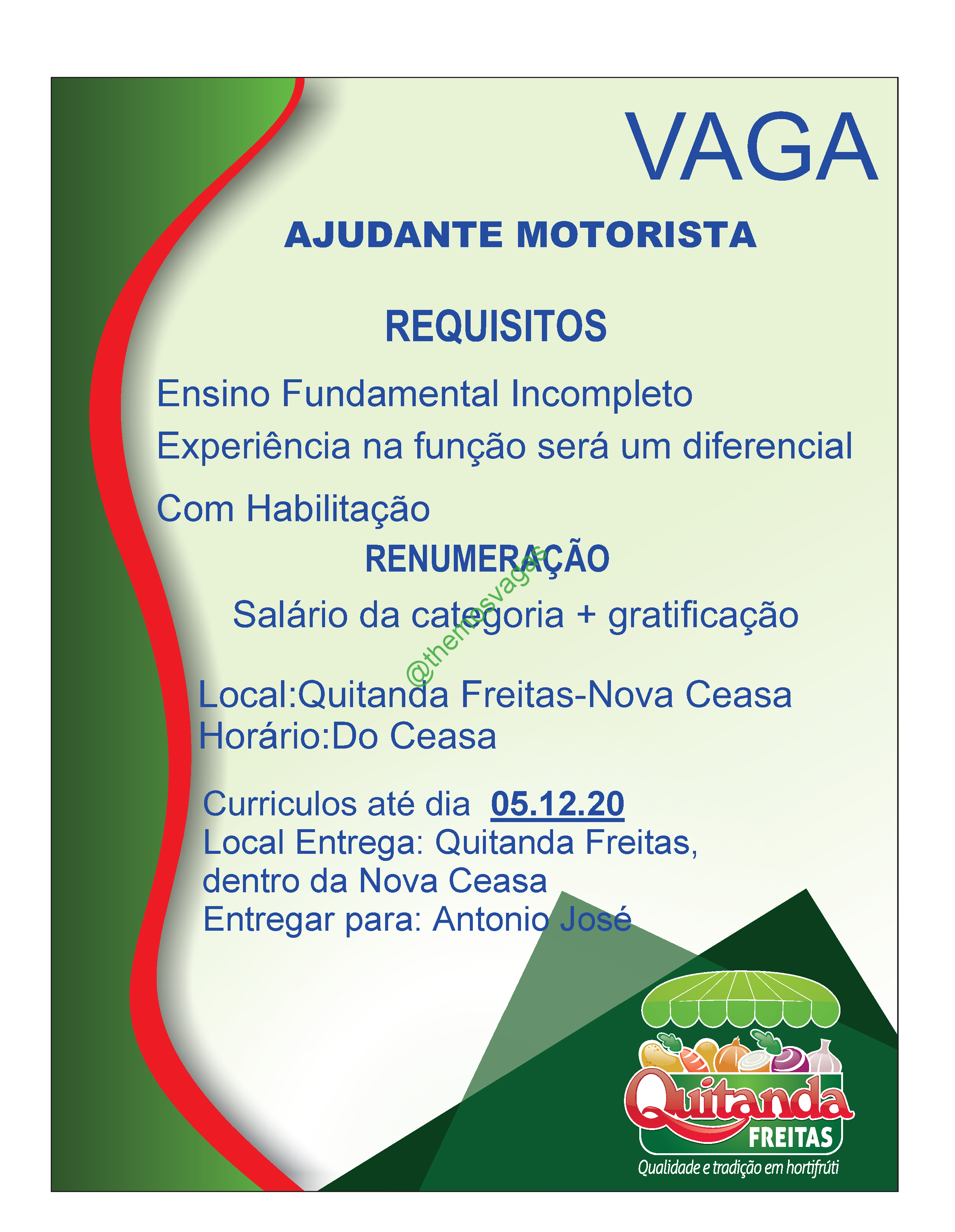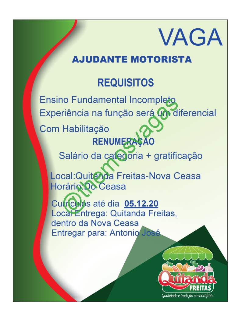 – Interessados(as) e que atendam ao perfil solicitado acima, devem entregar o currículo até 05/12/2020 na Nova Ceasa – Loja Quitanda Freitas