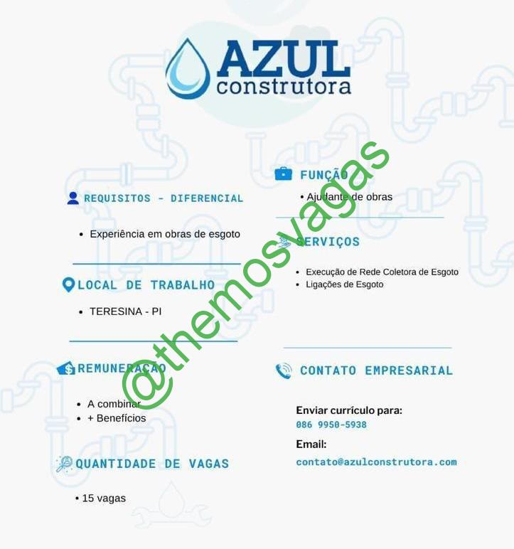 – Interessados(as) e que atendam ao perfil solicitado acima, devem enviar o currículo para o e-mail contato@azulconstrutora.com contendo no título/assunto “Ajudante de Obras – THE“.