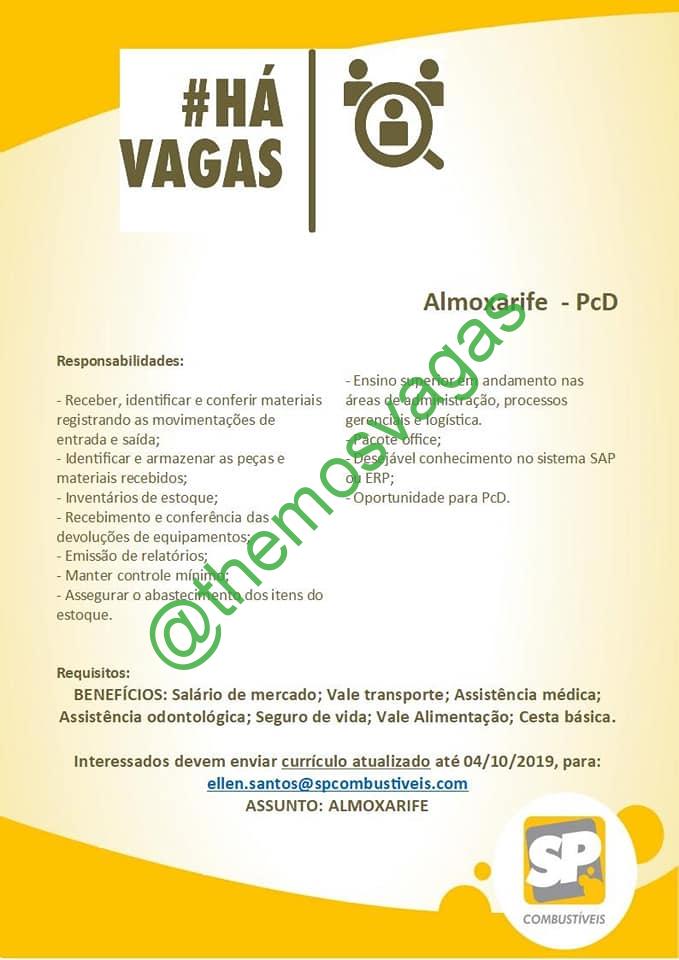 – Interessados(as) e que atendam ao perfil solicitado acima, devem enviar o currículo para o e-mail ellen.santos@spcombustiveis.com até o dia 04/10/2019 , colocando no título “Almoxarife”.