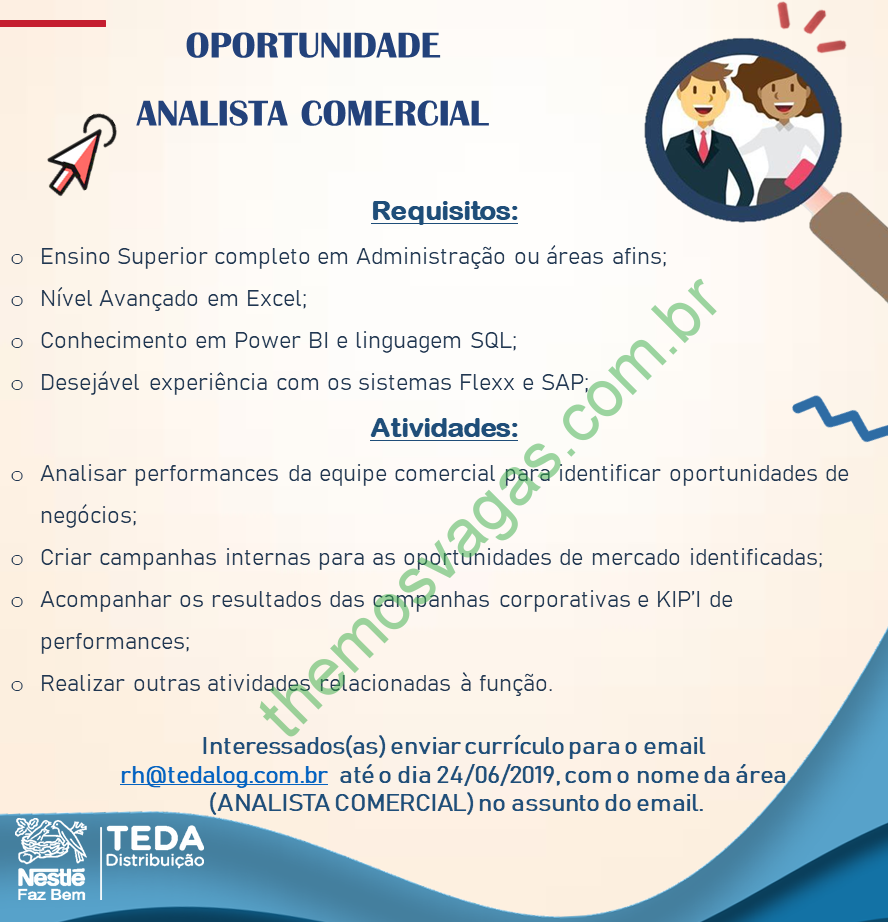 – Interessados(as) e que atendam ao perfil solicitado acima, devem enviar o currículo para o e-mail rh@tedalog.com.br até o dia 24/06/2019, colocando no título “Analista Comercial”.