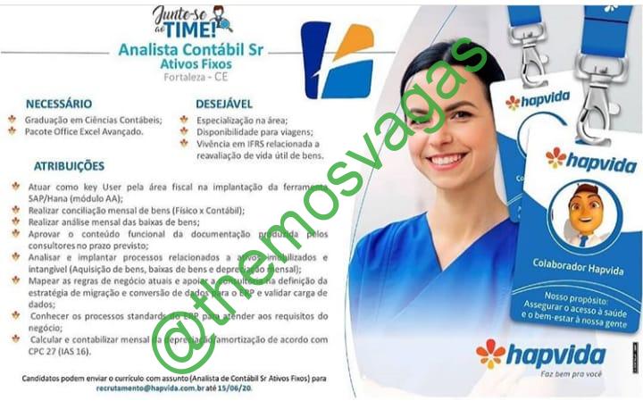 – Interessados(as) e que atendam ao perfil solicitado acima, devem até o dia 15/06/2020 enviar o currículo para o e-mail recrutamento@hapvida.com.br , colocando no título “Analista Contábil Sr”.
