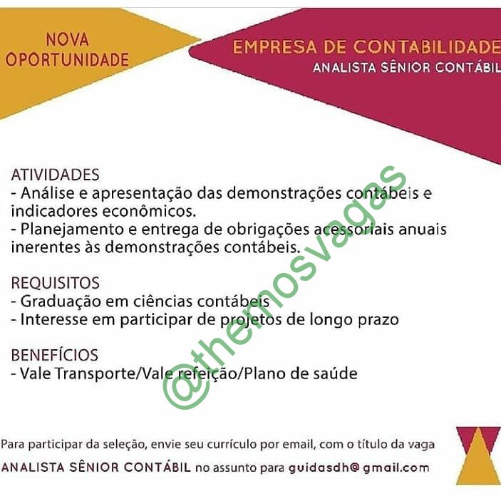 – Interessados(as) e que atendam ao perfil solicitado acima, devem enviar o currículo para o e-mail guidasdh@gmail.com , colocando no título “Analista Sênior Contábil”.