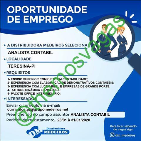 – Interessados(as) e que atendam ao perfil solicitado acima, devem enviar o currículo até 31/01/2020 para o e-mail curriculos.pi@grupomedeiros.net contendo no título/assunto “Analista Contábil”