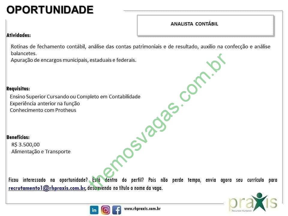 – Interessados(as) e que atendam ao perfil solicitado acima, devem enviar o currículo para o e-mail recrutamento1@rhpraxis.com.br colocando no título “Analista Contábil – FOR”.