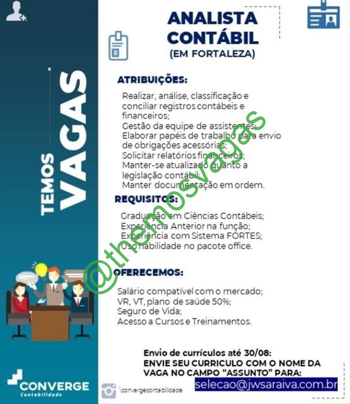 – Interessados que atendam ao perfil divulgado, devem encaminhar currículo  para selecao@jwsaraiva.com.br com o titulo/assunto “Analista Contábil – FOR