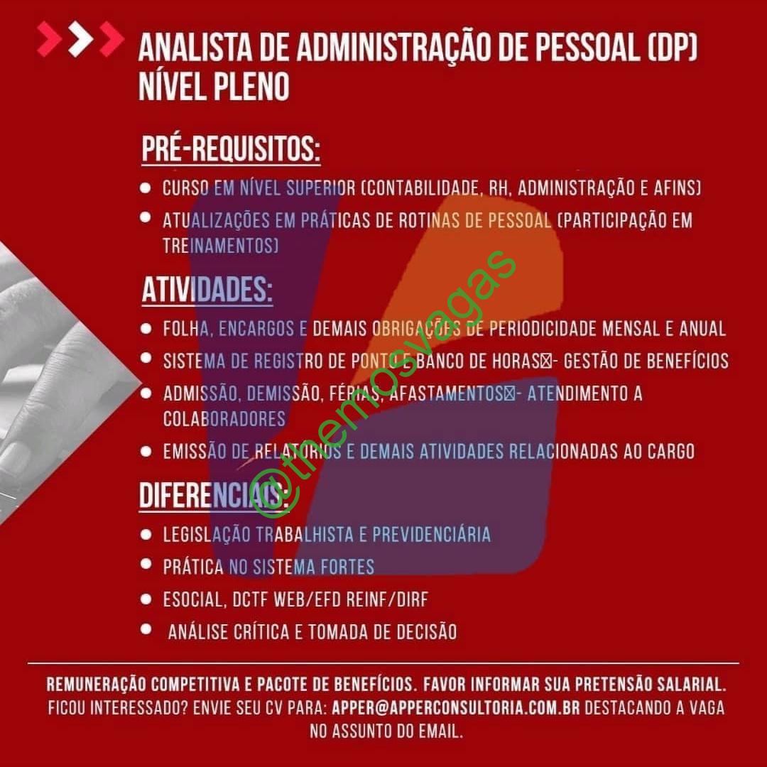 – Interessados(as) e que atendam ao perfil solicitado acima, devem enviar o currículo para o e-mail apper@apperconsultoria.com.br, contendo no título/assunto “Analista de Administração de Pessoal – FOR“.