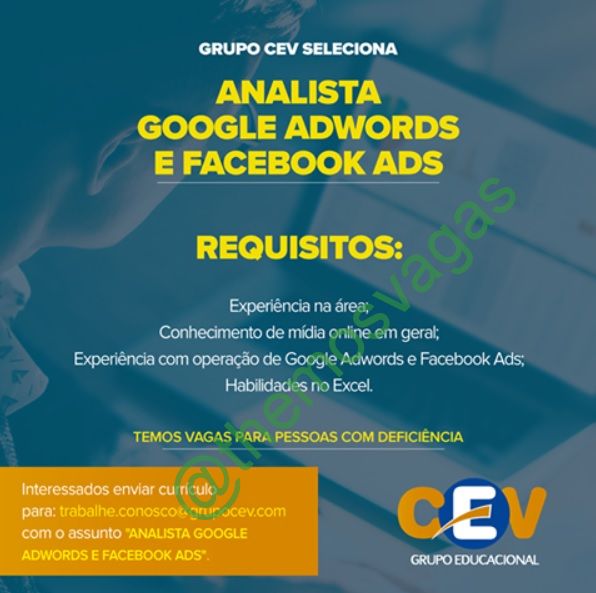 – Interessados(as) e que atendam ao perfil solicitado acima devem enviar o currículo para o e-mail trabalhe.conosco@grupocev.com contendo no título “Analista Google Adwords e Facebook ADS“.