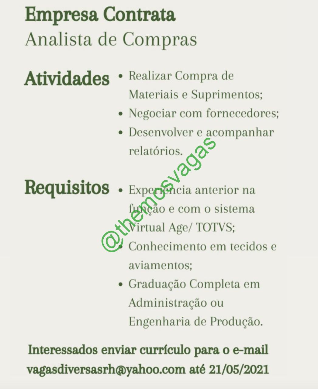 – Interessados(as) e que atendam ao perfil solicitado acima, devem enviar o currículo até 21|05|2021 para o e-mail vagasdiversasrh@yahoo.com, contendo no título/assunto “Analista de Compras – FOR“.