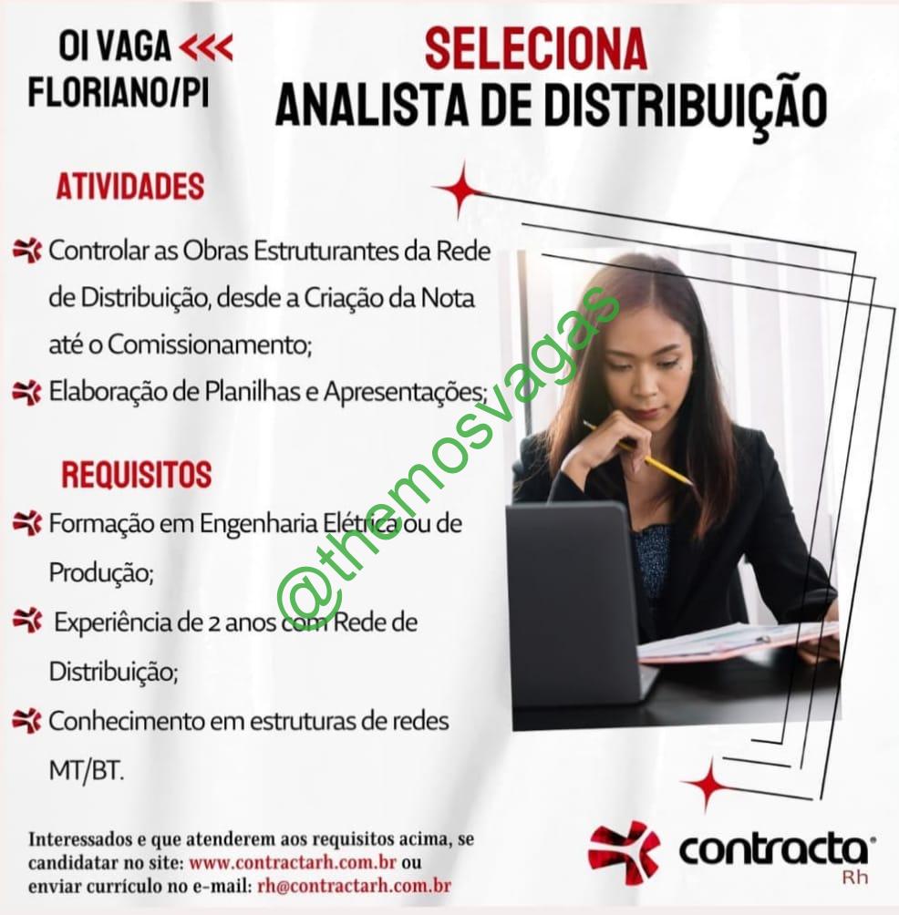 – Interessados(as) e que atendam ao perfil solicitado acima, devem enviar o currículo para o e-mail rh@contracta.com.br contendo no título/assunto “Analista de Distribuição Floriano