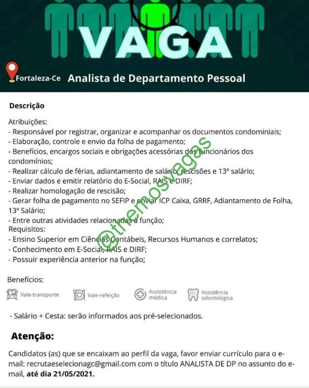 – Interessados(as) e que atendam ao perfil solicitado acima, devem enviar o currículo até 21|05|2021 para o e-mail recrutaeselecionagc@gmail.com, contendo no titulo/assunto “Analista de DP – FOR