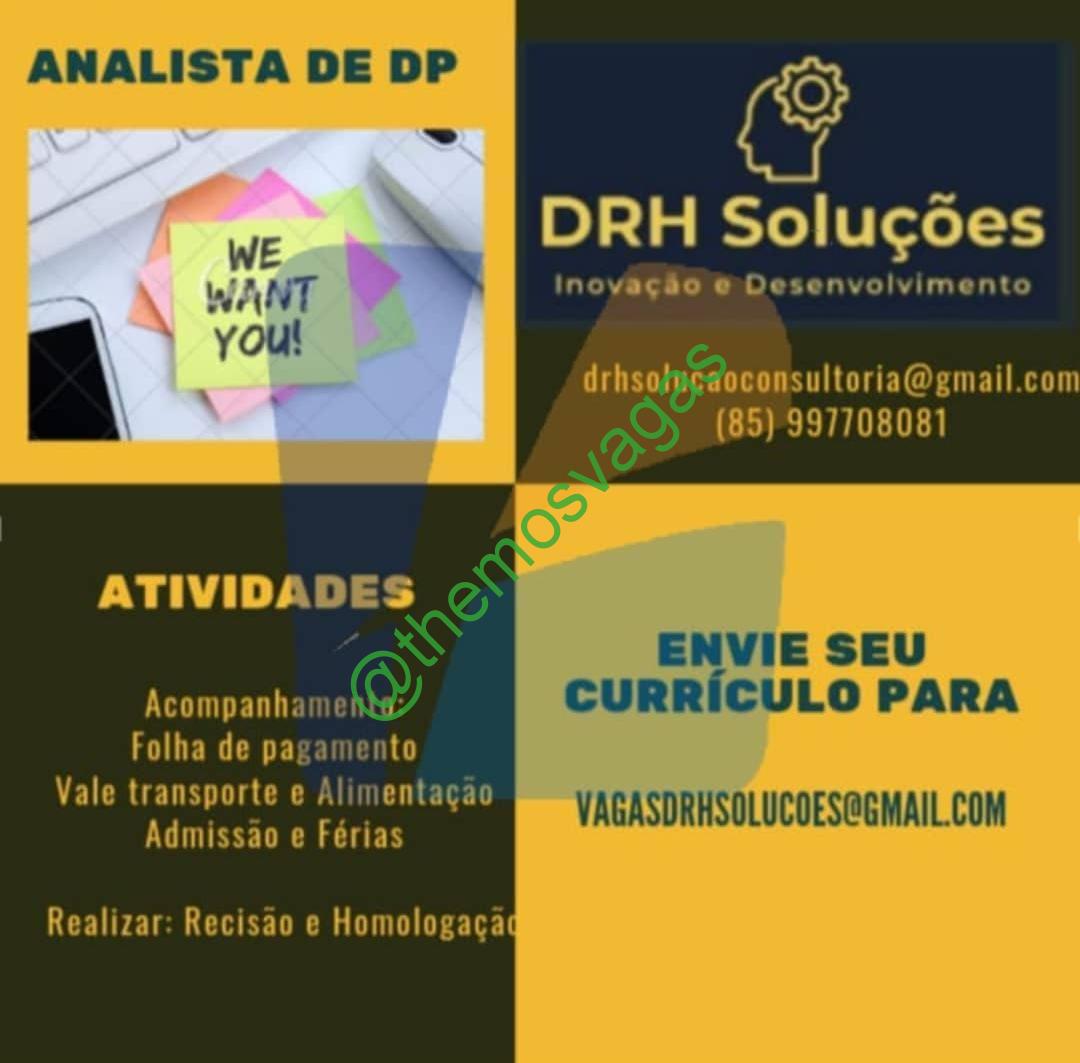 – Interessados(as) e que atendam ao perfil solicitado acima, devem enviar o currículo para o e-mail vagasdrhsolucoes@gmail.com, contendo no titulo/assunto “Analista de DP – FOR”.