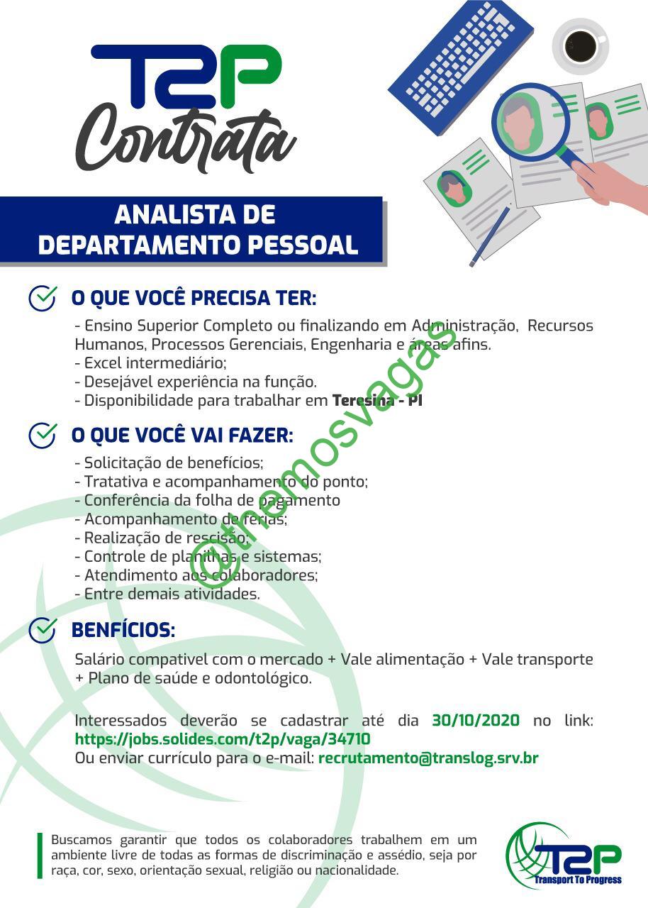 – Interessados(as) e que atendam ao perfil solicitado acima, devem enviar o currículo até 30/10/2020 para o e-mail recrutamento@translog.srv.br contendo no título/assunto “Analista de DP THE