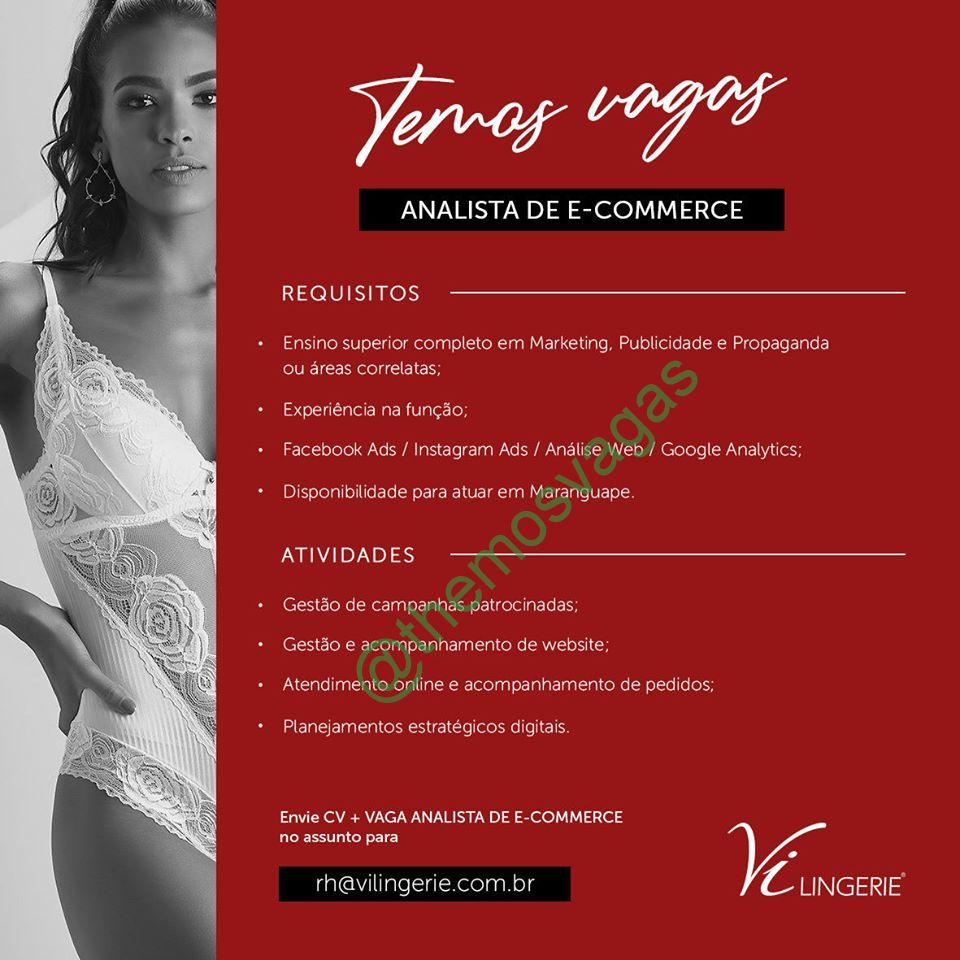– Interessados(as) e que atendam ao perfil solicitado acima, devem enviar o currículo para o e-mail rh@vilingerie.com.br , colocando no título “Analista de E-commerce”.