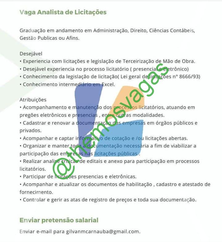 – Interessados(as) e que atendam ao perfil solicitado acima, devem enviar o currículo para o e-mail gilvanmcarnauba@gmail.com , colocando no título “Analista de Licitações”.
