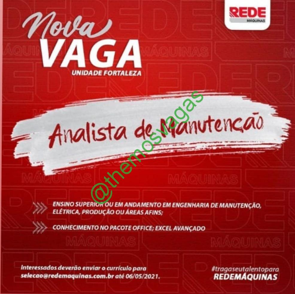 – Interessados(as) e que atendam ao perfil solicitado acima, devem enviar o currículo até 06/05/2021 para o e-mail selecao@redemaquinas.com.br, contendo no título/assunto “Analista de Manutenção – FOR”.