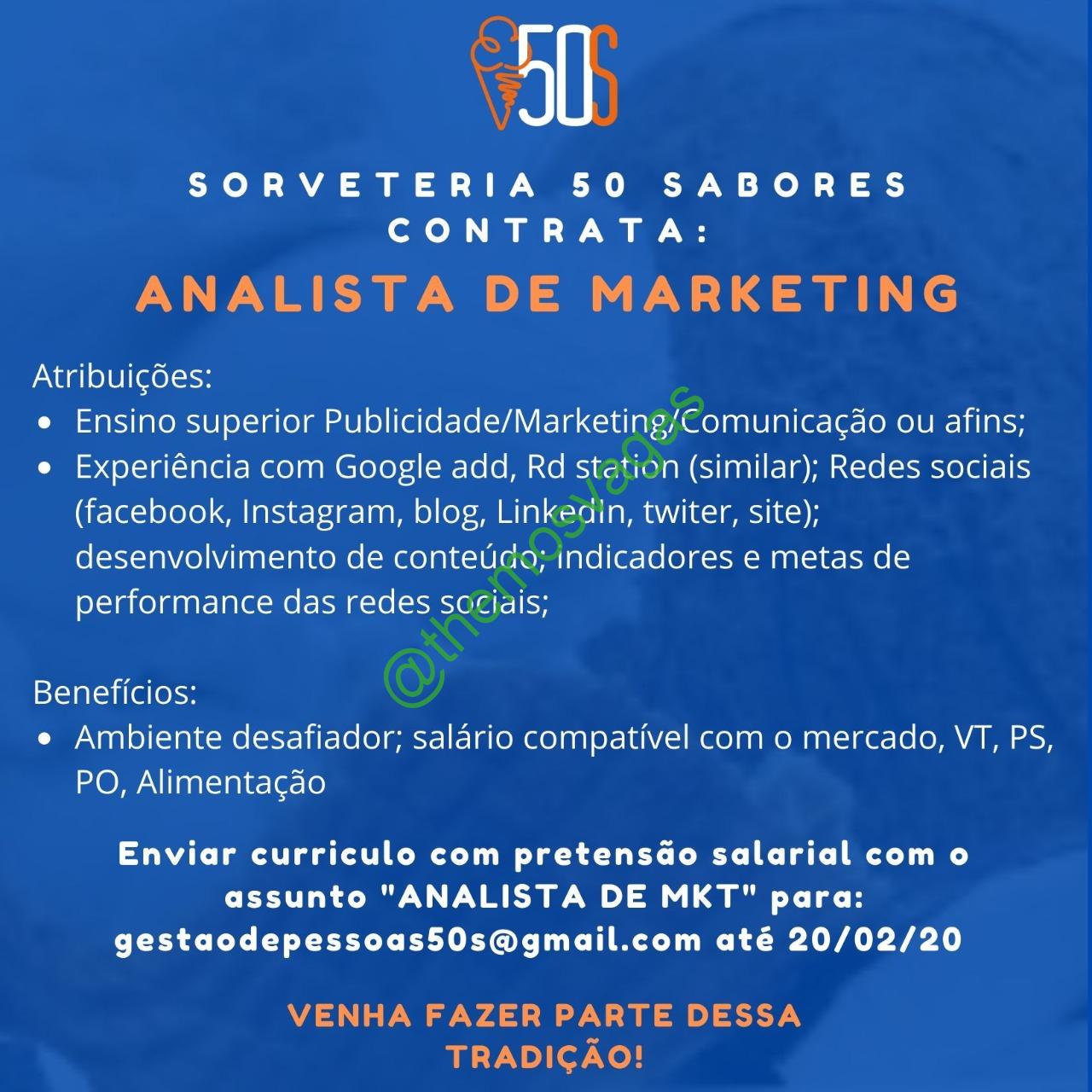– Interessados(as) e que atendam ao perfil solicitado acima, devem até o dia 20/02/2020 enviar o currículo para o e-mail gestaodepessoas50s@gmail.com , colocando no título “Analista de Marketing”.