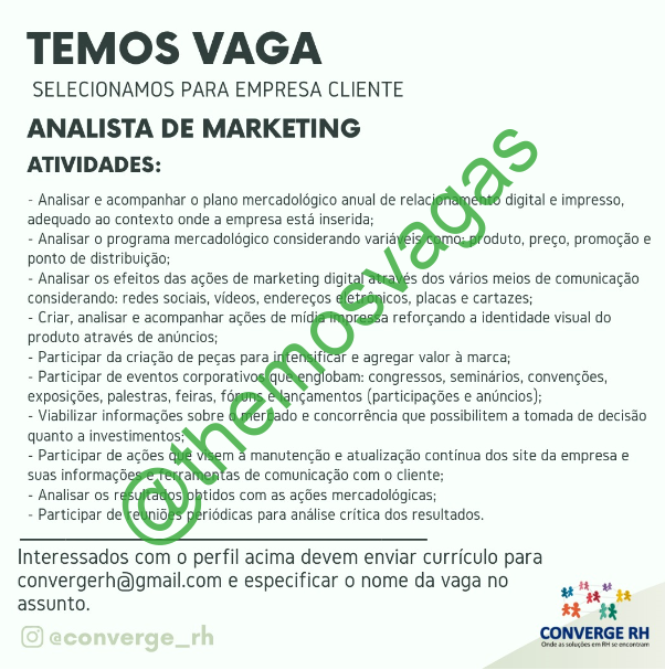 – Interessados(as) e que atendam ao perfil solicitado acima, devem enviar o currículo para o e-mail convergerh@gmail.com , colocando no título “Analista de Marketing”.