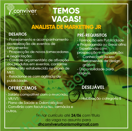 – Interessados(as) e que atendam ao perfil solicitado acima, devem enviar o currículo para o e-mail dhconviverurbanismo@gmail.com , colocando no título “Analista de Marketing Jr.”.