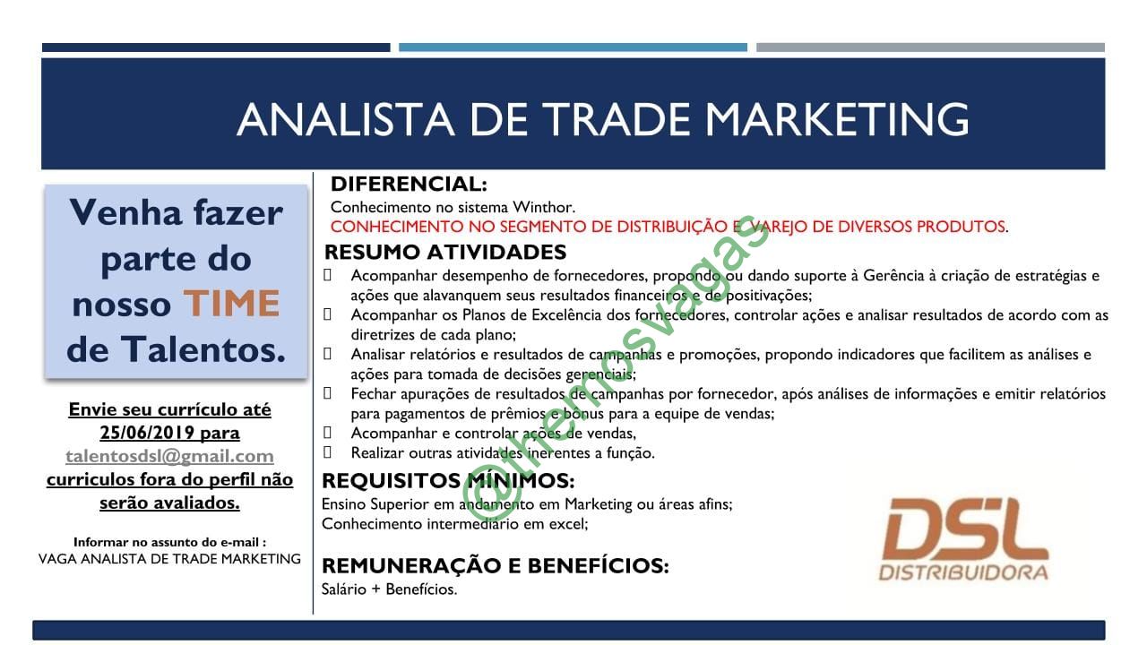 – Interessados(as) e que atendam ao perfil solicitado acima, devem enviar o currículo para o e-mail talentosdsl@gmail.com até o dia 25/06/2019 , colocando no título “Vaga Analista de Trade Marketing”.