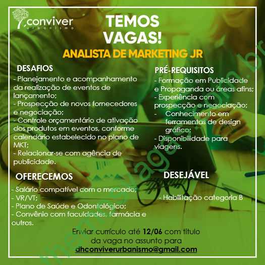 – Interessados(as) e que atendam ao perfil solicitado acima, devem enviar o currículo para o e-mail dhconviverurbanismo@gmail.com até o dia 12/06/2019, colocando no título “Analista de Marketing Jr.”.