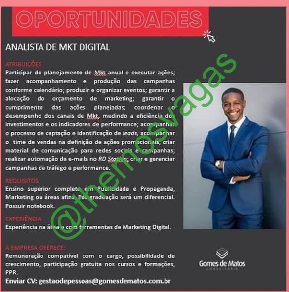 –  Interessados(as) e que atendam ao perfil solicitado acima, devem enviar o currículo para o e-mail gestaodepessoas@gomesdematos.com.br, contendo no título/assunto “Analista de Marketing Digital – FOR” .