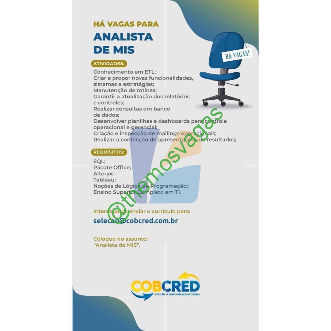 – Interessados(as) e que atendam ao perfil solicitado acima, devem enviar o currículo para o e-mail selecao@cobcred.com.br, contendo no titulo/assunto “Analista de MIS – FOR