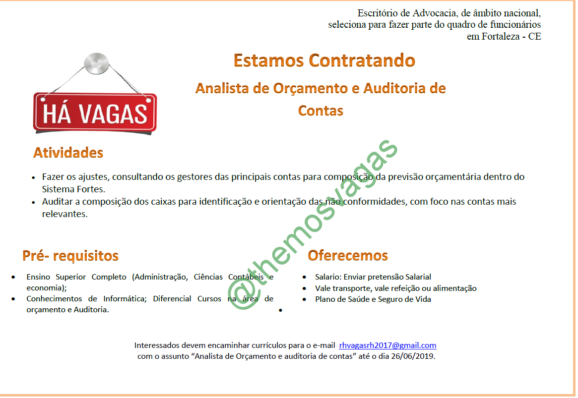 – Interessados(as) e que atendam ao perfil solicitado acima, devem enviar o currículo para o e-mail rhvagasrh2017@gmail.com até o dia 26/06/2019, colocando no título “Analista de Orçamento e Auditoria de Contas”.