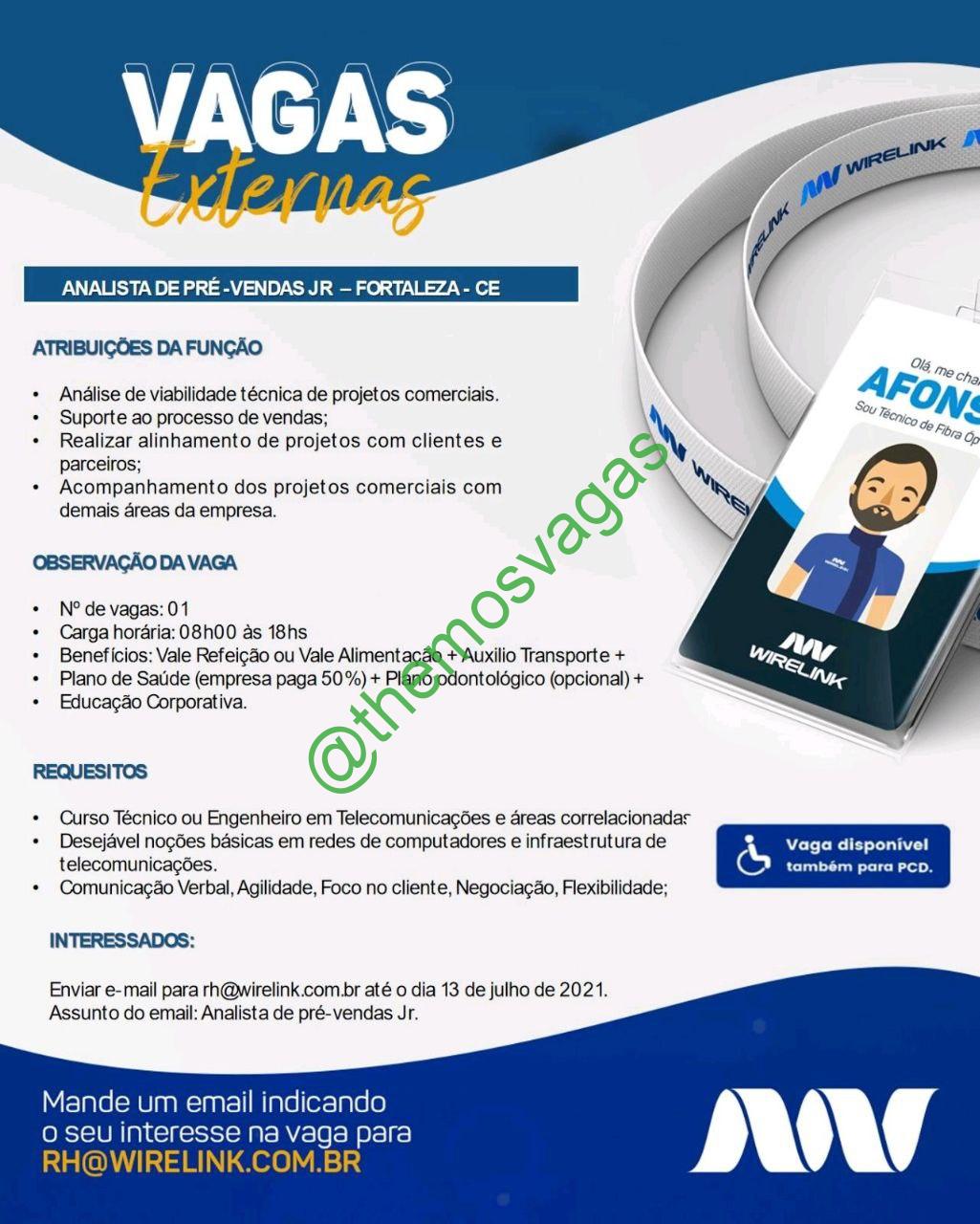 – Interessados(as) e que atendam ao perfil solicitado acima, devem enviar o currículo até 13|07|2021 para o e-mail rh@wirelink.com.br, contendo no titulo/assunto “Analista de Pré-vendas Junior – FOR”