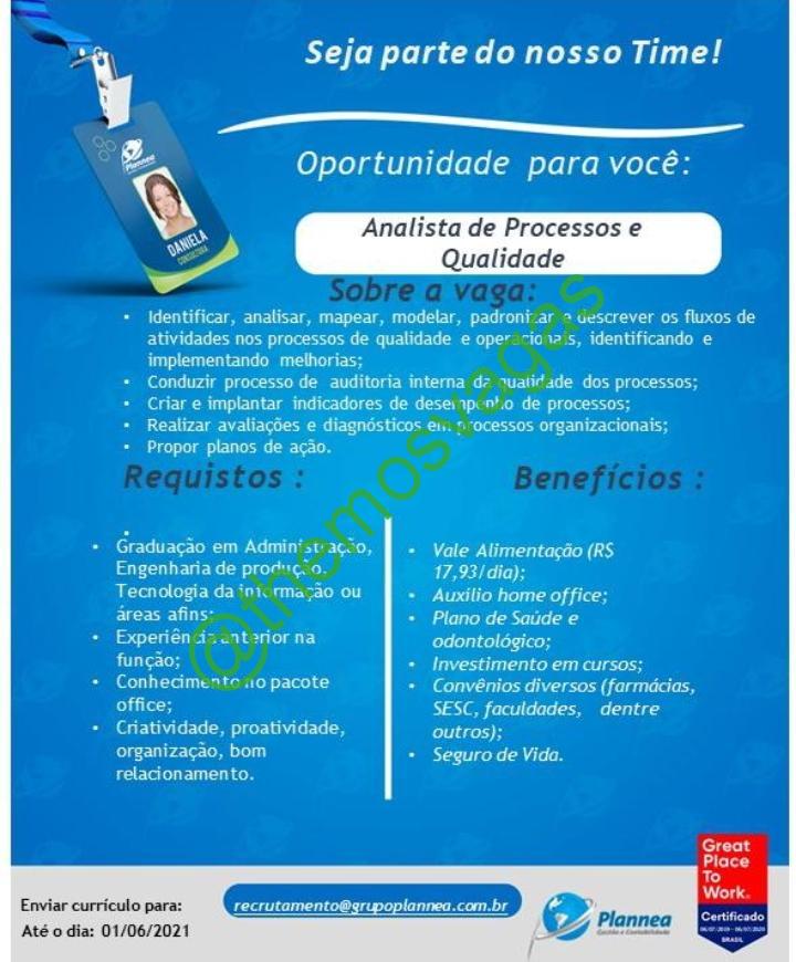 –  Interessados(as) e que atendam ao perfil solicitado acima, devem enviar o currículo até 01/06/2021 para o e-mail recrutamento@grupoplannea.com.br, contendo no título/assunto “Analista de Processos e Qualidadel – FOR“.