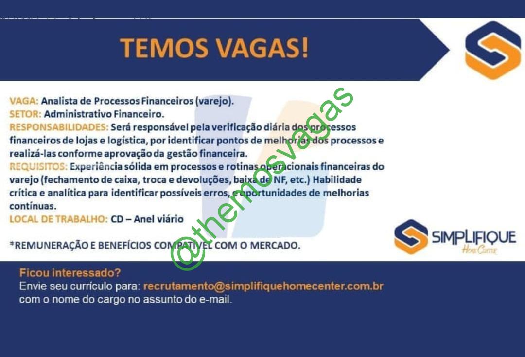 – Interessados(as) e que atendam ao perfil solicitado acima, devem enviar o currículo para o e-mail recrutamento@simplifiquehomecenter.com.br, contendo no titulo/assunto “Analista de Processos Financeiro (Varejo) – FOR