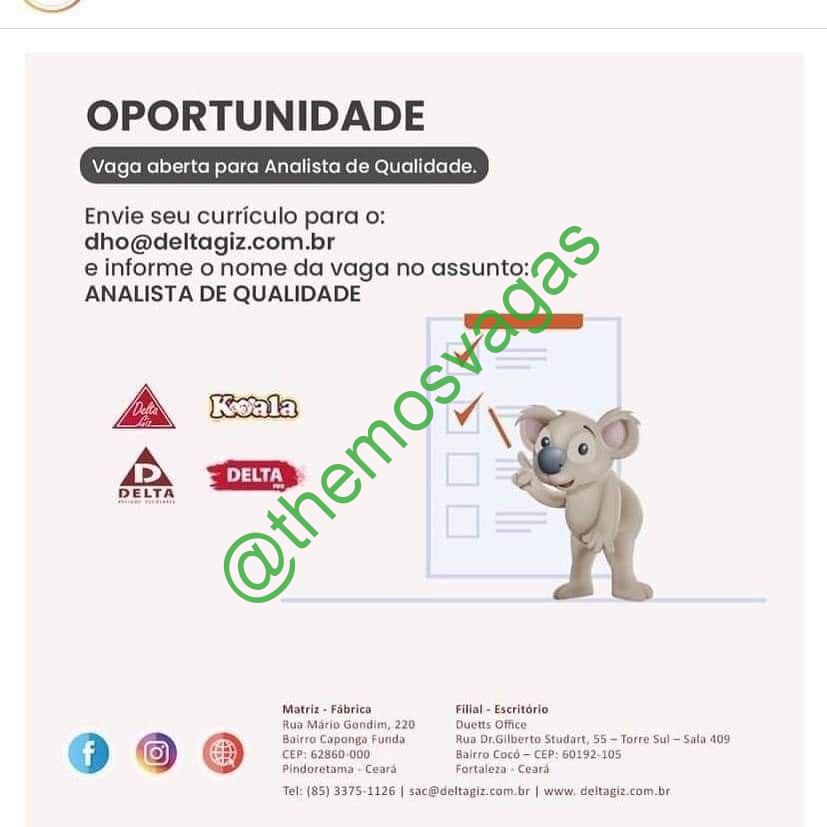 – Interessados(as) e que atendam ao perfil solicitado acima, devem enviar o currículo para o e-mail dho@deltagiz.com.br, contendo no titulo/assunto “Analista de Qualidade – FOR”