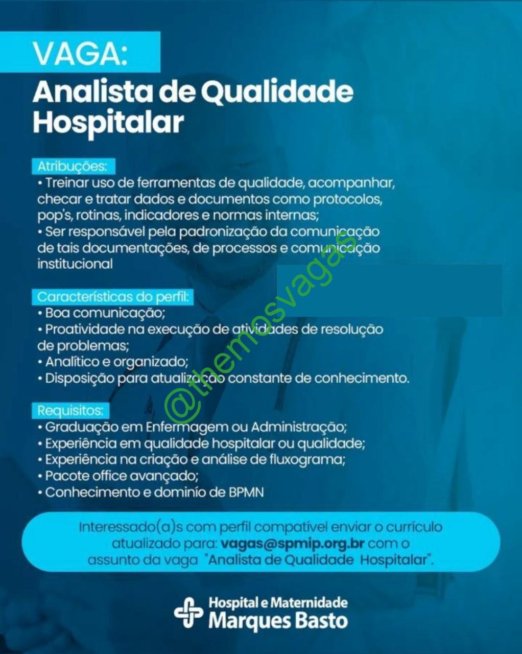 – Interessados(as) e que atendam ao perfil solicitado acima, devem enviar o currículo para o e-mail vagas@spmip.org.br contendo no título/assunto “Analista de Qualidade Hospitalar