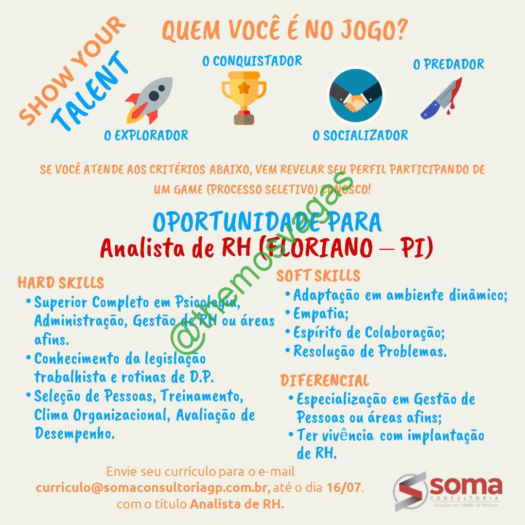 – Interessados(as) e que atendam ao perfil solicitado acima, devem enviar o currículo até 16/07/2020 para o e-mail curriculo@somaconsultoriagp.com.br contendo no título/assunto “Analista de RH