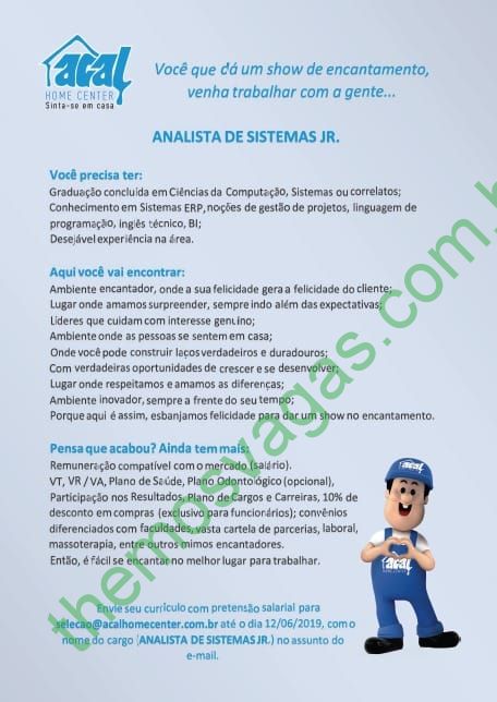 – Interessados(as) e que atendam ao perfil solicitado acima, devem enviar o currículo com pretensão salarial para o e-mail selecao@acalhomecenter.com.br até o dia 12/06/2019, colocando no título “Analista de Sistemas Jr”.