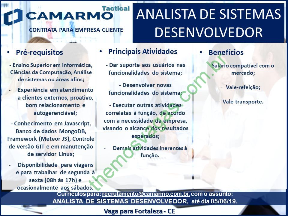 – Interessados(as) e que atendam ao perfil solicitado acima, devem enviar o currículo para o e-mail recrutamento@camarmo.com.br até o dia 05/2019 , colocando no título “Analista de Sistemas Desenvolvedor(a)”.