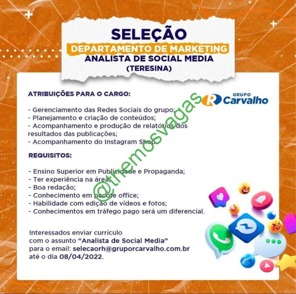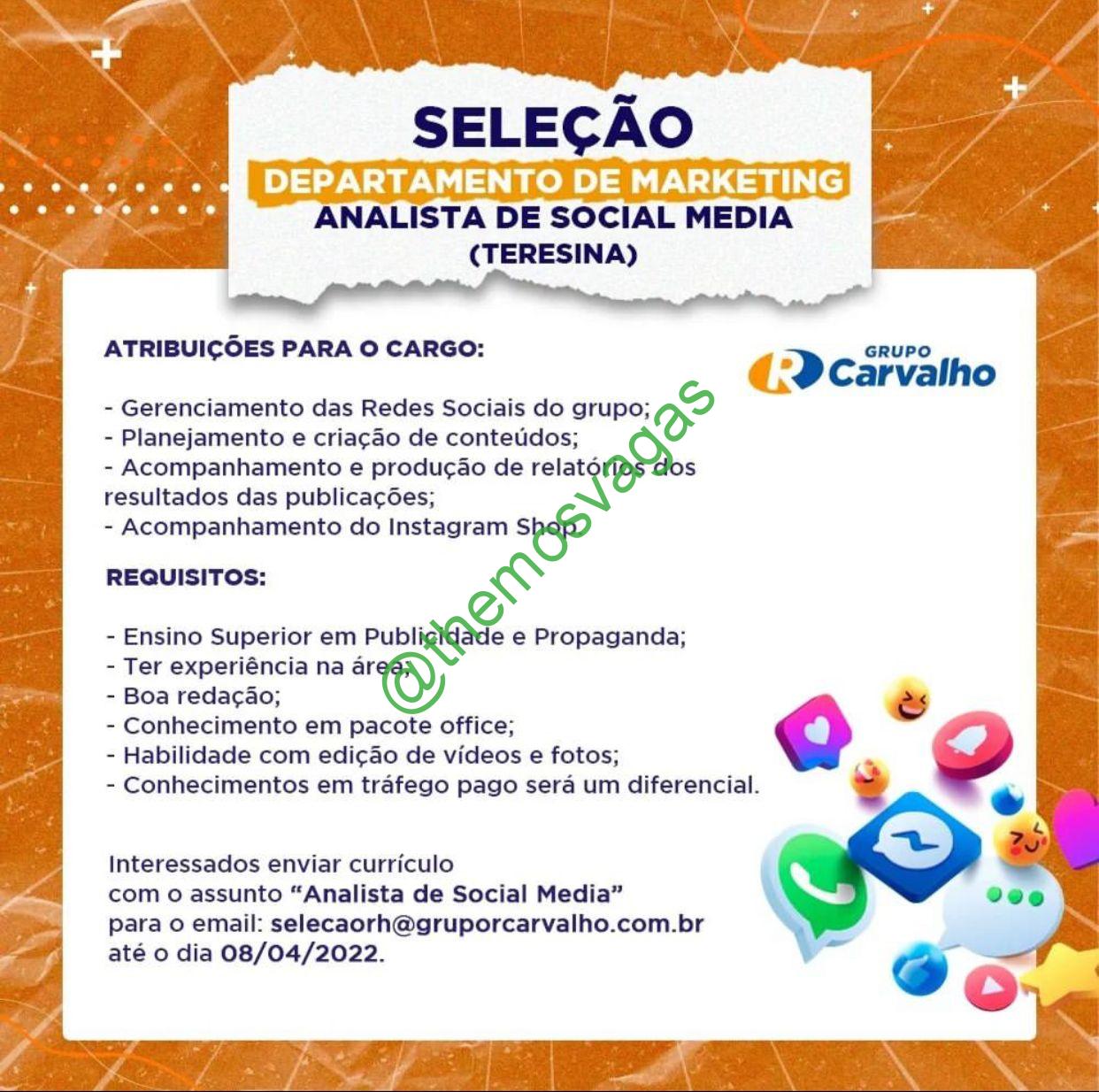 – Interessados(as) e que atendam ao perfil solicitado acima, devem enviar o currículo até 08/04/2022  para o e-mail selecaorh@gruporcarvalho.com.br contendo no título/assunto “Analista de Social Media