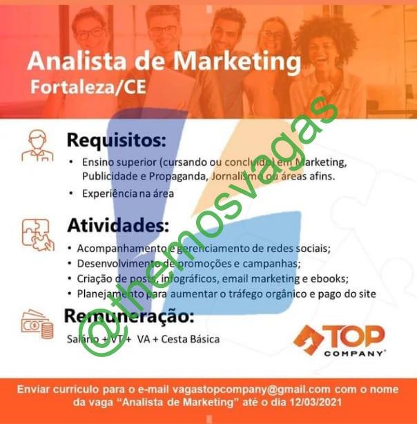 – Interessados(as) e que atendam ao perfil solicitado acima, devem enviar o currículo até 12/03/2021  para o e-mail vagastopcompany@gmail.com contendo no título/assunto “Analista de Marketing – FOR”