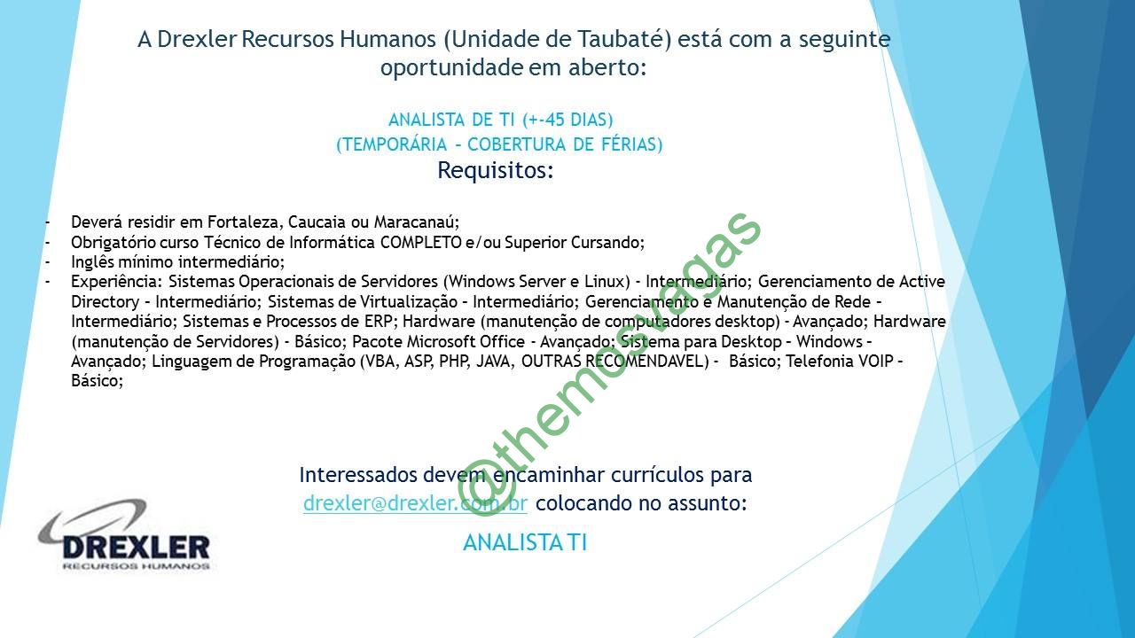 – Interessados(as) e que atendam ao perfil solicitado acima, devem enviar o currículo para o e-mail drexler@drexler.com.br , colocando no título “Analista de TI”.