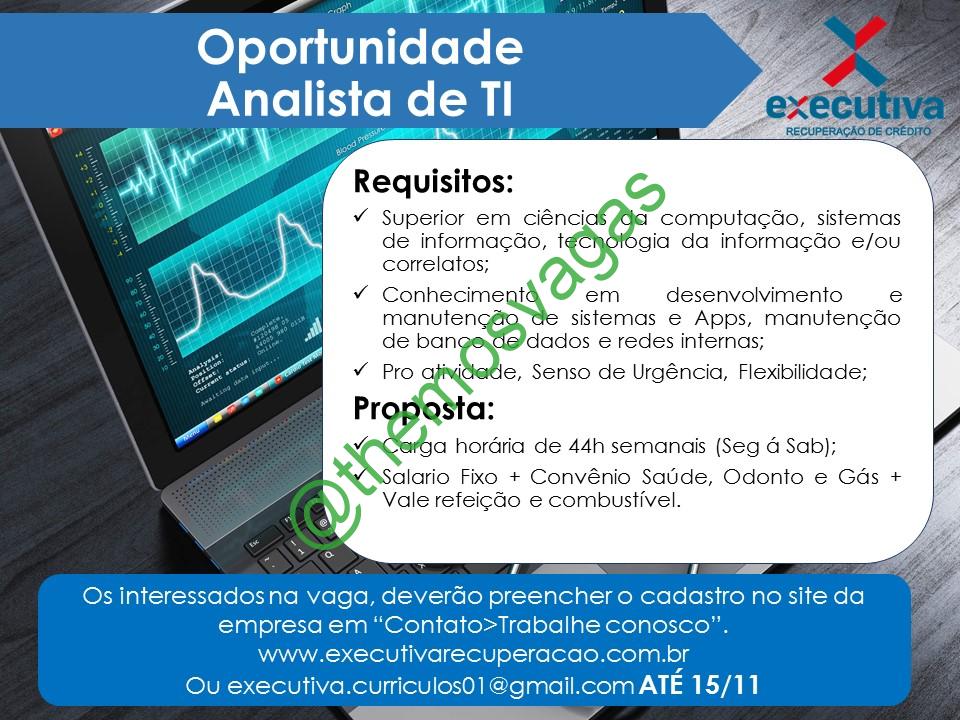 – Interessados(as) e que atendam ao perfil solicitado acima, devem enviar o currículo até 15/11/2019 para o e-mail executiva.curriculos01@gmail.com contendo no título/assunto “Analista de TI THE“.