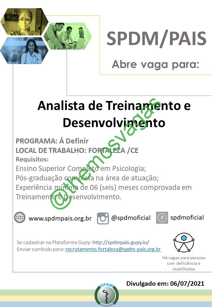– Interessados(as) e que atendam ao perfil solicitado acima, devem enviar o currículo para o e-mail recrutamento.fortaleza@spdm-pais.org.br, contendo no titulo/assunto “Analista de Treinamento e Desenvolvimento – FOR”