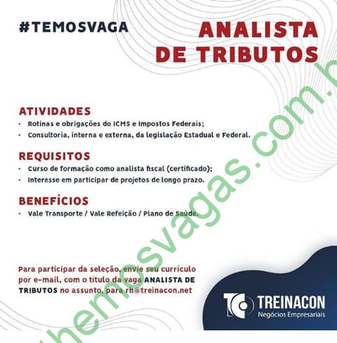 – Interessados(as) e que atendam ao perfil solicitado acima, devem enviar o currículo para o e-mail rh@treinacon.net colocando no título “Analista de Tributos”.