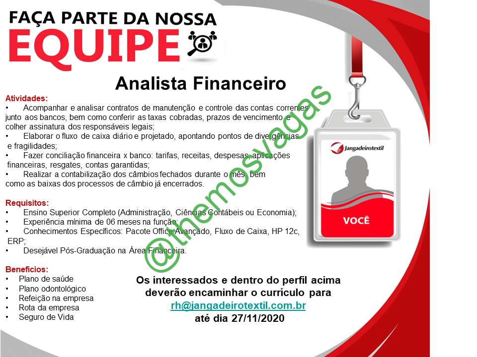 – Interessados(as) e que atendam ao perfil solicitado acima, devem enviar o currículo  para o e-mail rh@jangadeirotextil.com.br contendo no título/assunto “Analista Financeiro – FOR“.