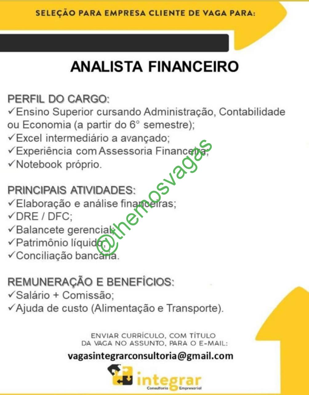 – Interessados(as) e que atendam ao perfil solicitado acima, devem enviar o currículo para o e-mail vagasintegrarconsultoria@gmail.com, contendo no titulo/assunto “Analista Financeiro – FOR