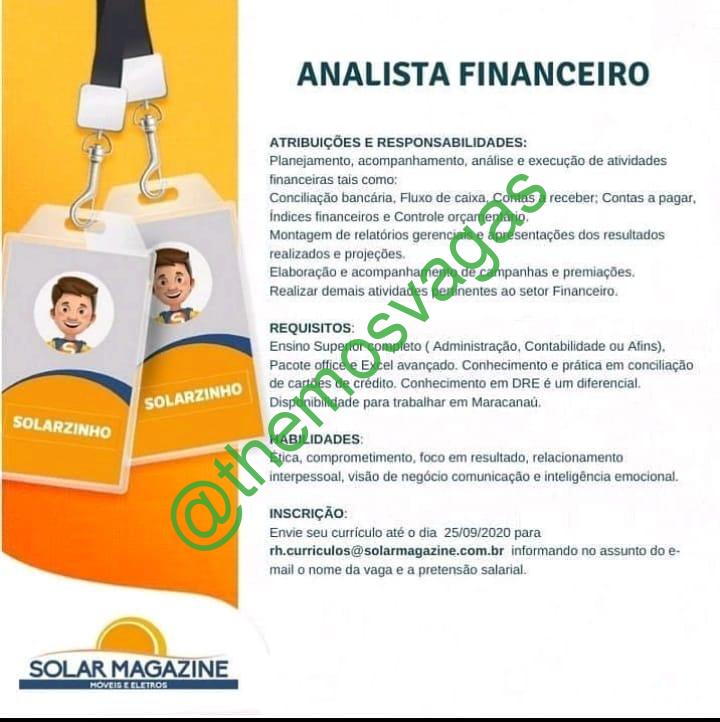 – Interessados(as) e que atendam ao perfil solicitado acima, devem enviar o currículo para o e-mail rh.curriculos@solarmagazine.com.br , colocando no título/assunto “Analista Financeiro – FOR”.