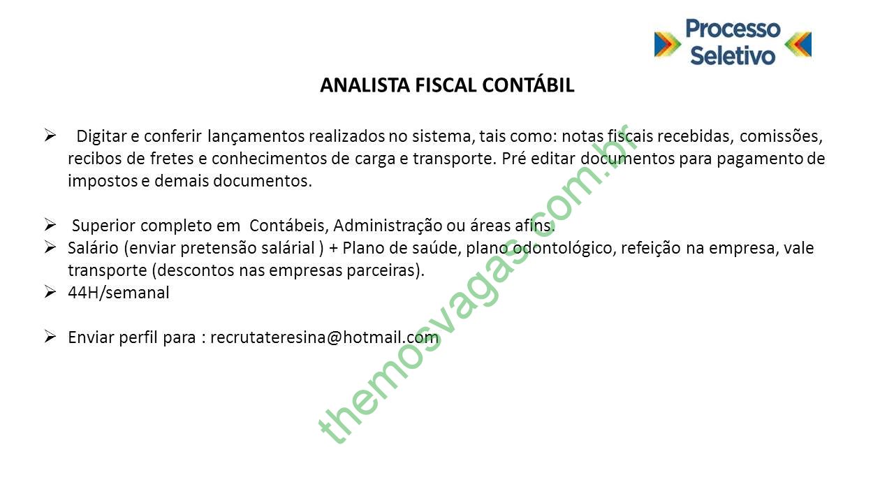 Interessados(as) e que atendam aos requisitos exigidos na imagem acima devem enviar o perfil profissional, contendo no título/assunto do e-mail “Analista Fiscal Contábil”, para recrutateresina@hotmail.com .